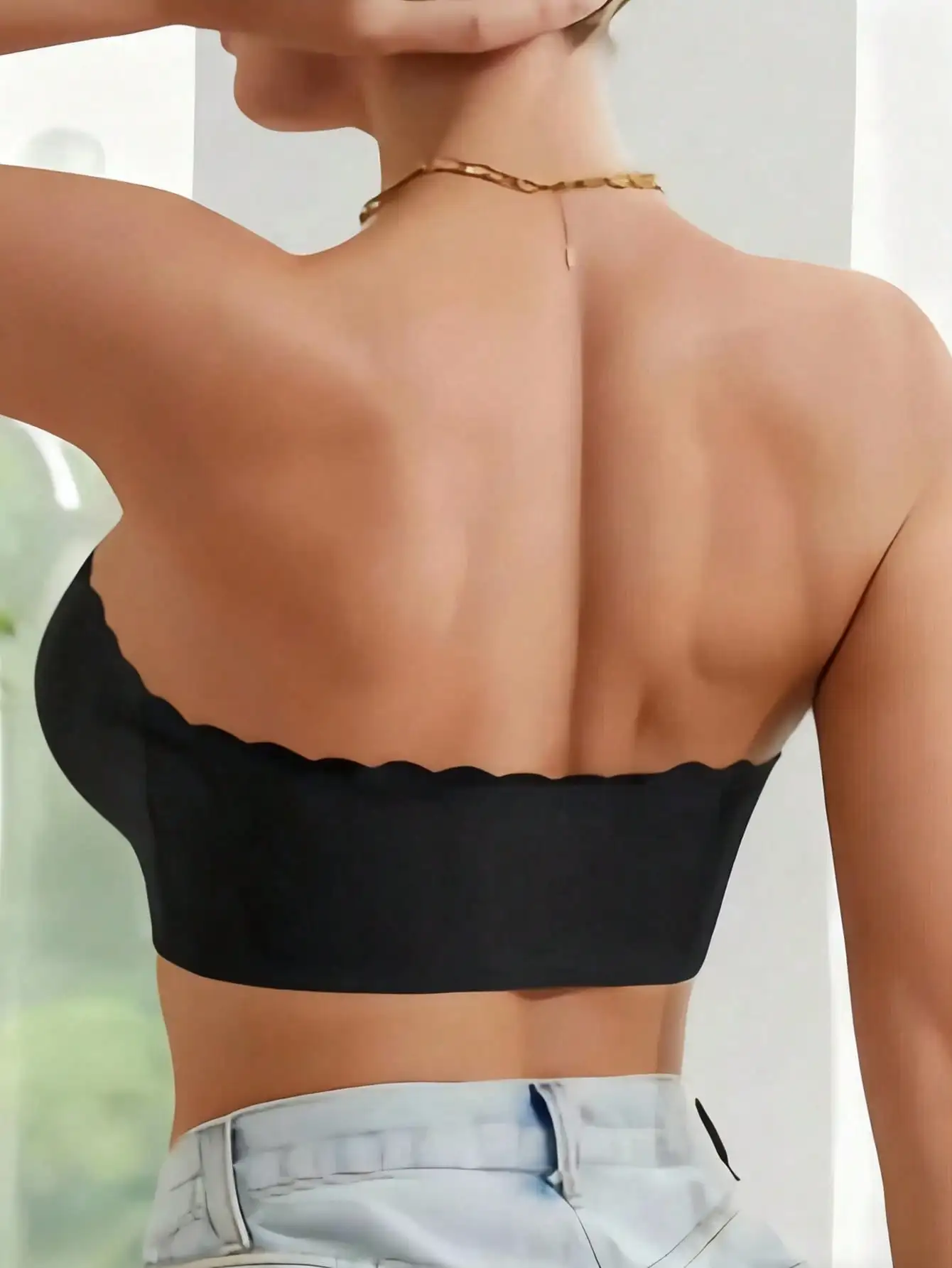 Stay secure and stylish with this strapless bra featuring a convenient front closure and removable padding for customizable support. The wavy edge design adds a subtle, elegant detail while the soft, stretchy fabric ensures comfort and a smooth fit under any outfit.